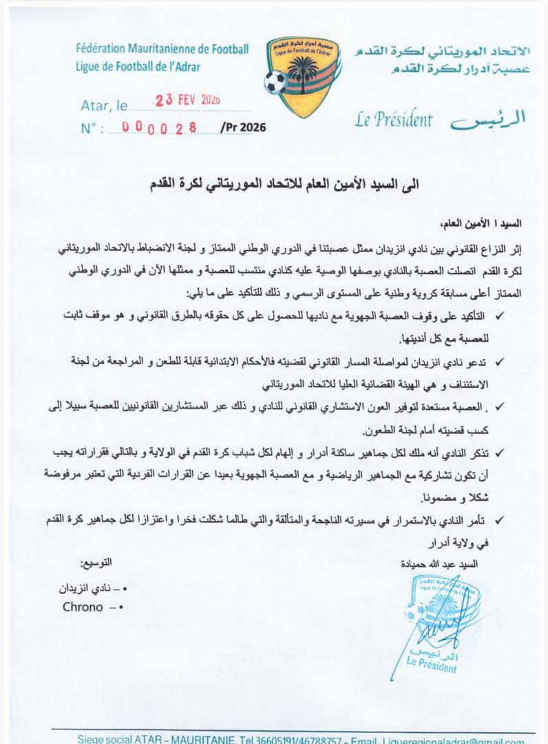 En pleine crise avec les instances disciplinaires nationales, le FC Nzidane ( SuperD1), basé à Atar, a décidé de suspendre ses entraînements et de mettre en congé, pour une durée indéterminée, ses joueurs et son staff technique, dans l’attente de l’issue du litige en cours.