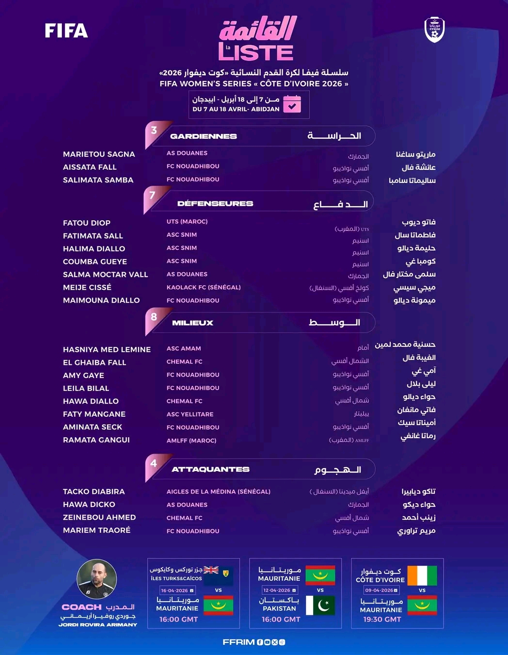 La sélection nationale féminine de Mauritanie s’apprête à relever un nouveau défi international en participant à la FIFA Women’s Series – Côte d’Ivoire 2026, prévue à Abidjan du 7 au 18 avril.
